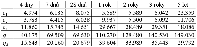 Řešení tohoto problému lze vidět také ve změně definice užité funkce (1). Pro tuto aplikaci 2e modelu na studium vlivu stáří betonu na lomové parametry byla užita úprava hodnot parametrů uvedených v Tab. 1 aproximací standardními genetickými algoritmy [2] s kritériem minima parametru c1. Minimální hodnota tohoto parametru je vhodná z hlediska jednoznačnosti řešení a zároveň zajišťuje nejvyšší míru stability funkce vzhledem k chybě určení parametrů c2 a c3. Výsledky aproximací jsou uvedeny v Tab. 2.