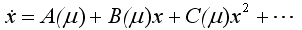V okolí bifurkačního bodu rozvineme definiční funkci systému do Taylorovy řady: