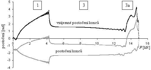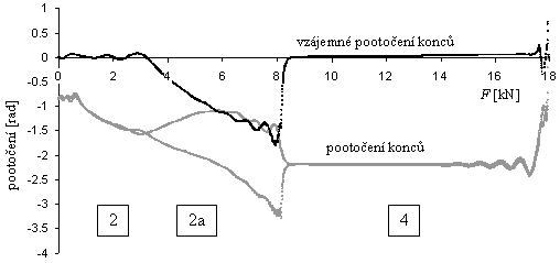 Simulace dokumentovaná digramem na obr. 11 měla následující průběh: Prut po zatížení silou F = 18 kN se po vybočení ustálil se do symetrického tvaru 4. Po snížení síly F pod hodnotu asi 8.4 kN nastal pád na nesymetrický tvar 2a, který byl stabilní až do hodnoty cca 3.4 kN. Poté došlo k přechodu na symetrický tvar 2, který zůstal stabilní do dosažení bifurkačního bodu Fcr2 = 789 N. Překročení bifurkačního bodu mohlo vést k vybočení do symetrického tvaru 1, ovšem k této události nebyl dostatek času vzhledem k dokmitávání prutu a relativně rychlému snižování zatěžující síly.