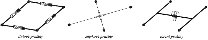Každý obdélníkový dílec, ze kterého se model prutu skládá, obsahuje vnitřní pružiny, jejichž schémata jsou zobrazena na obr. 3. Jedná se o liniové pružiny zajišťující normálovou tuhost a přenos ohybových momentů mezi hmotnými body (viz dále), smykové pružiny pro přenos smyku v rovině dílce a torzní pružiny pro zajištění kroutící tuhosti dílce.