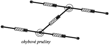 Již bylo zmíněno, že liniové pružiny plní rovněž funkci přenosu ohybových momentů. Proto jsou znázorněny na obr. 3 jako teleskopické tyče. Množinu pružin je totiž třeba doplnit rotační pružinou zajišťující vzájemnou ohybovou tuhost dvou spojených dílců. Znázornění této pružiny a její napojení na teleskopické tyče je vidět na obr. 4.