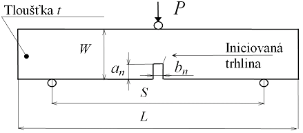 Obr. 1 Konfigurace zkoušky tříbodovým ohybem vzorku s centrálním zářezem [2]