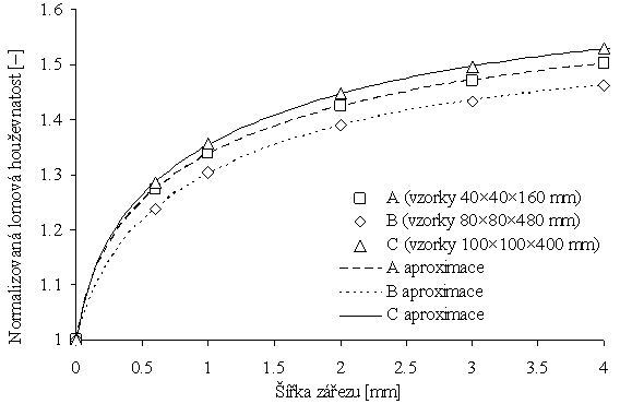 Experimenty pro získání hodnot lomově-mechanických veličin stavebních materiálů bývají prováděny na tvarově různých tělesech [1]. K nejpoužívanější konfiguraci patří zkouška ve tříbodovém ohybu vzorků tvaru trámců s centrálním zářezem – viz obr. 1. Magistrální trhlina v takovém případě vzniká v místě zářezu/vrubu, viz např. [2]. Příspěvek se opírá o dříve provedené výpočty metodou konečných prvků, které analyzovaly vliv šířky zářezu pro různé geometrie vzorku/zkoušky na iniciaci počáteční trhliny. Tento vliv na získané hodnoty efektivní lomové houževnatosti autoři kvantifikují a na tomto základě zde uvádějí nalezené regresní funkce pro jeho korekci.