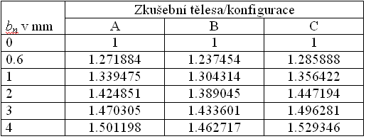 Tab. 2 Hodnoty normalizovaného faktoru intenzity napětí pro tři velikosti zkušebních těles a různé šířky zářezu bn